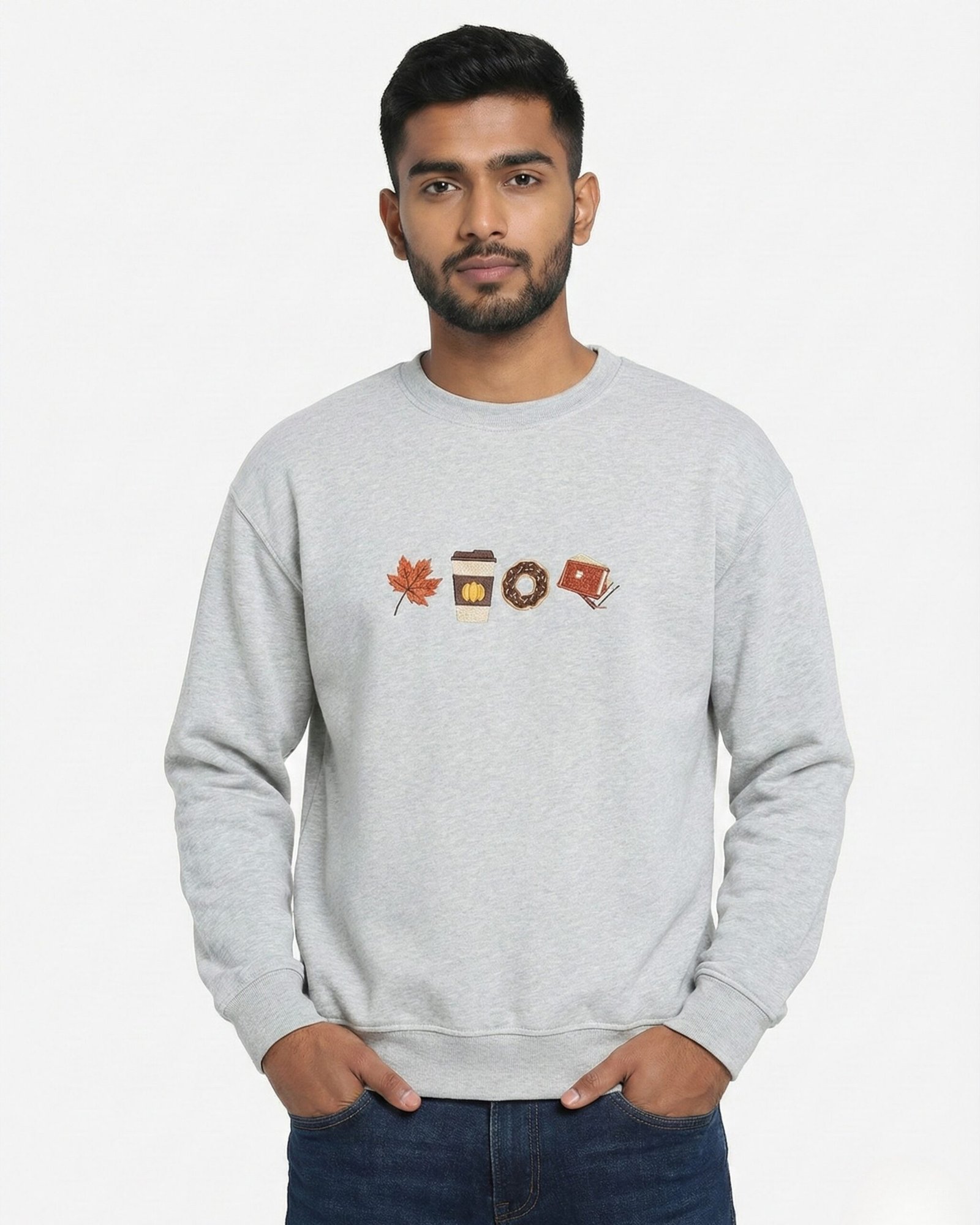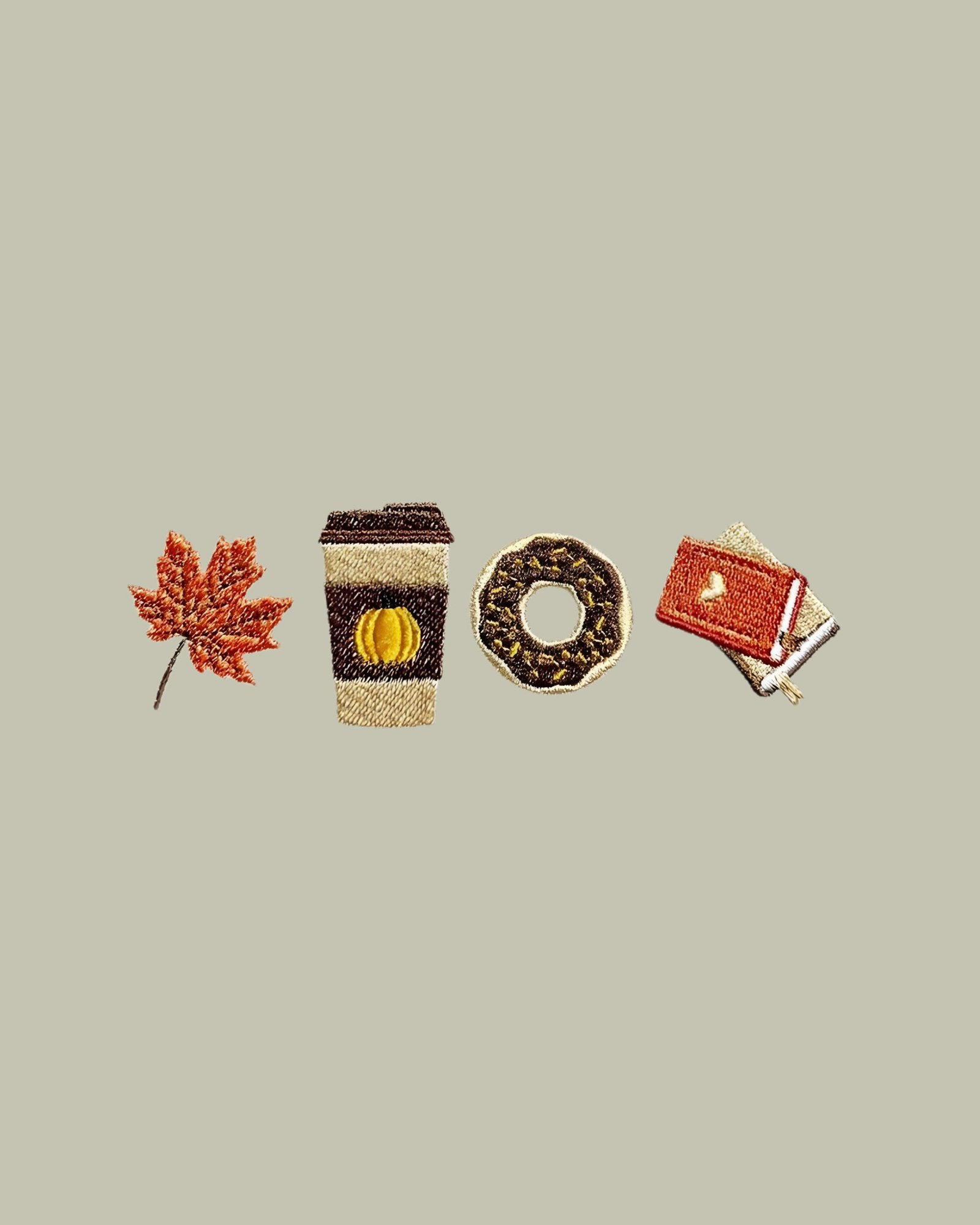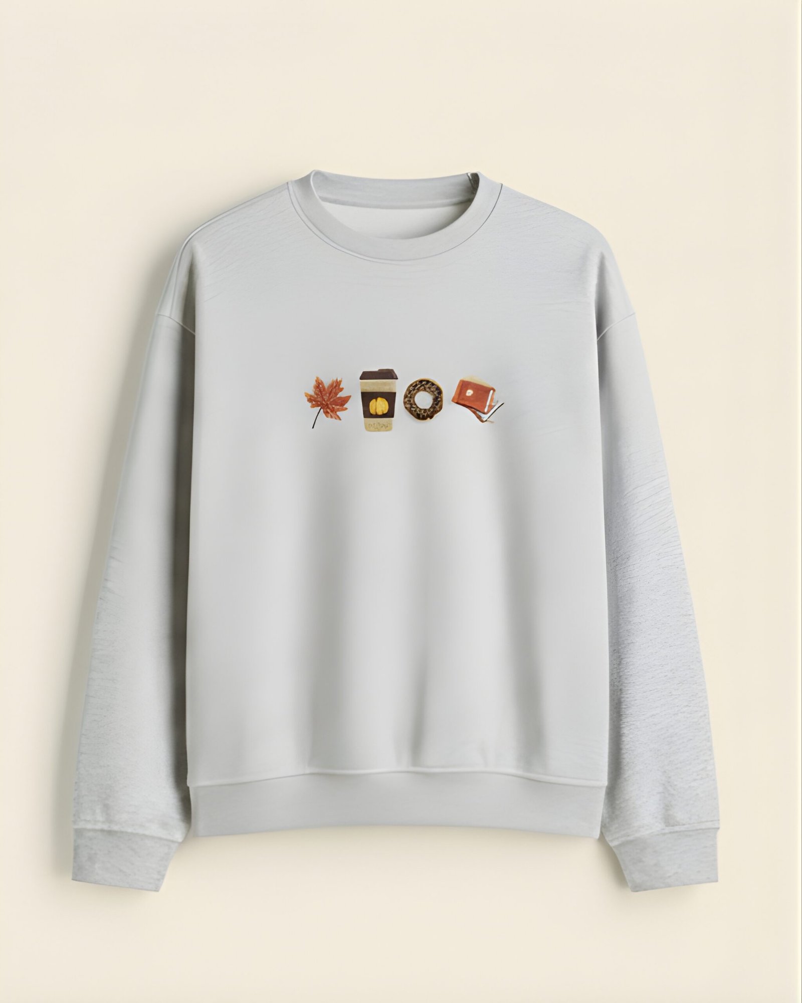 The centerpiece of this garment is the meticulous, high-density embroidery across the chest. This detail defines the ‘Autumn Chapters’—a sequence of four hand-finished icons representing the season’s simple pleasures: a vibrant amber maple leaf, a steaming pumpkin-motif coffee, a decadent chocolate-glazed donut, and a stack of tethered journals. This textured, storytelling motif transforms a foundational wardrobe essential into a sophisticated conversation starter for the modern minimalist.